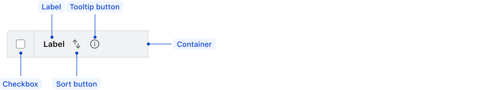 Sortable header columns have interactive state variants, indicating their interactivity. Non-sortable header columns are static and do not include state variants.