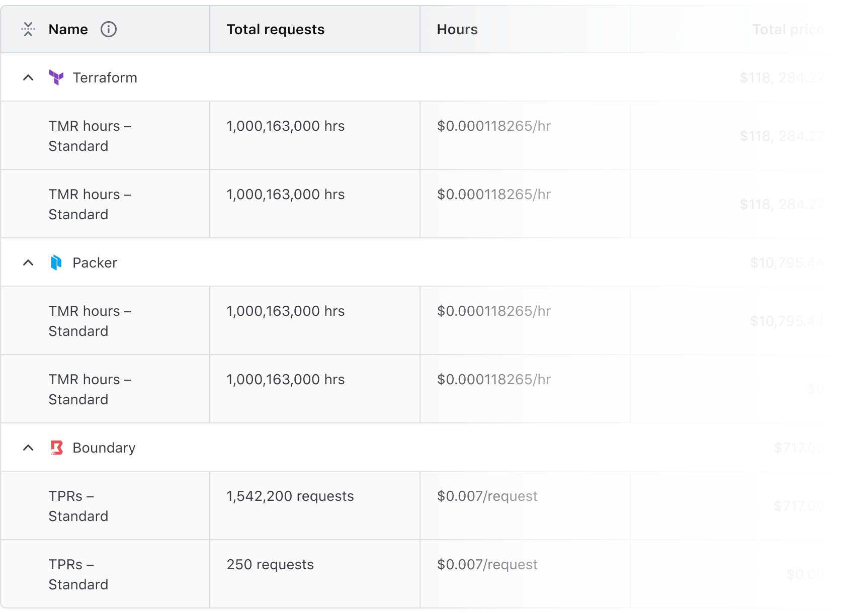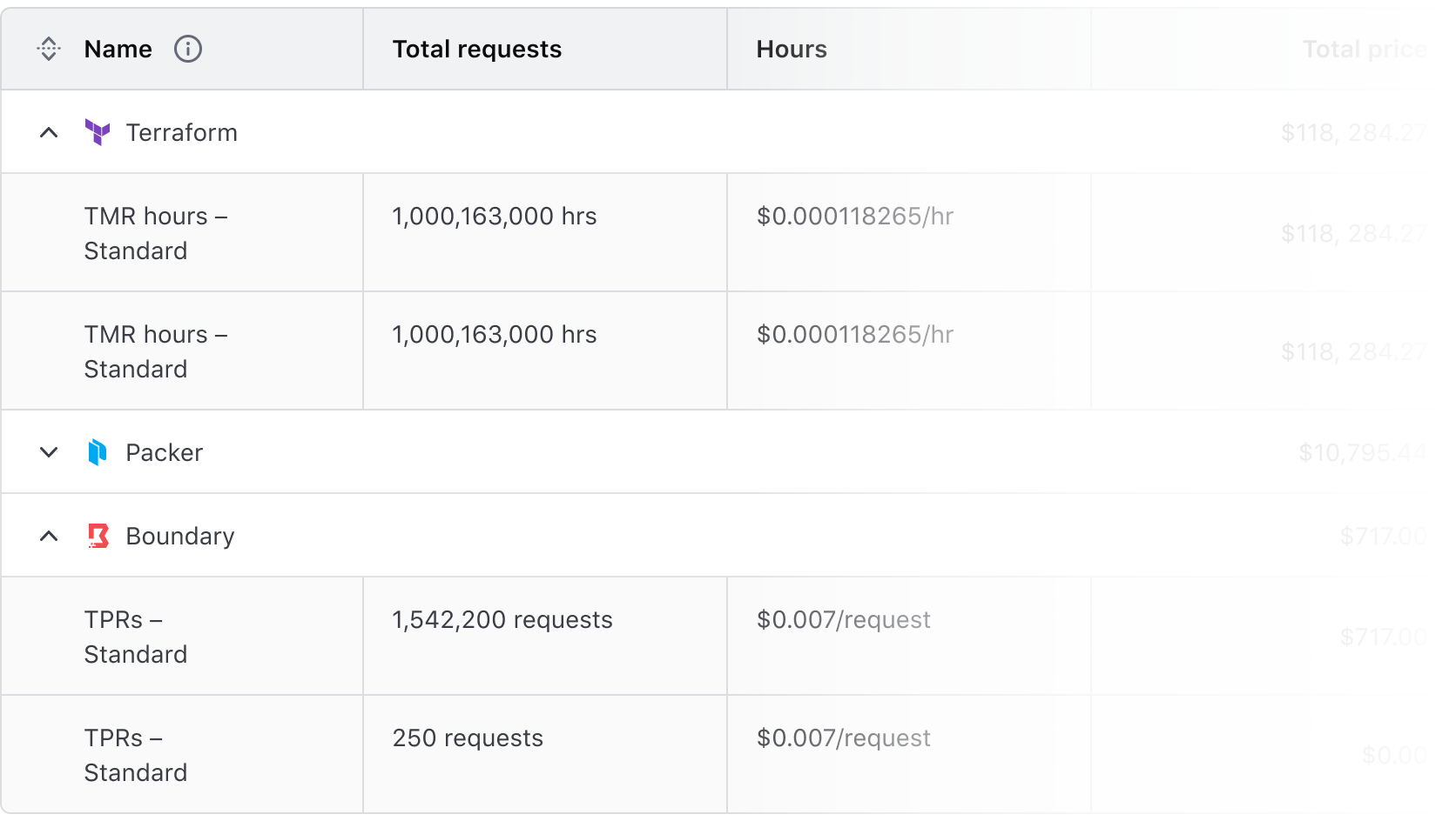 Advanced Table expandable rows. The parent rows display a summary of a Hashicorp product and the total price, the children rows show a breakdown of each billing item from that product and their individual cost.